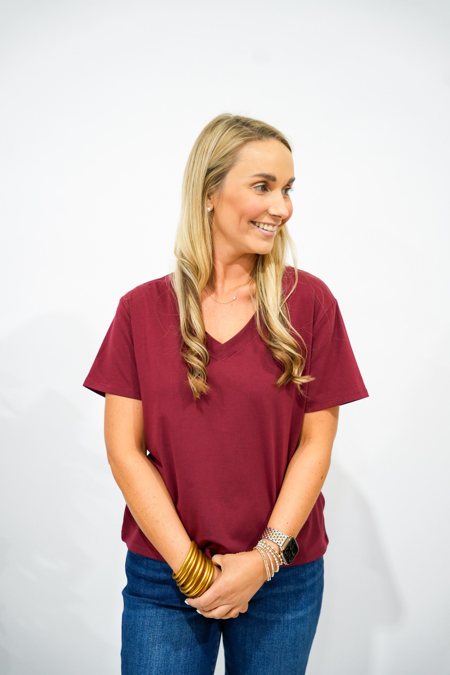 The effortless Amaya v-neck tee is an essential piece is for both comfort and elegance in any wardrobe. Its short-sleeve with a flattering v-neck, cut for versatility for a relaxed fit, making it an essential piece in your collection of cozy wear. Versatile t-shirt that pairs perfectly with jeans, skirts, or under a blazer for a sophisticated look.