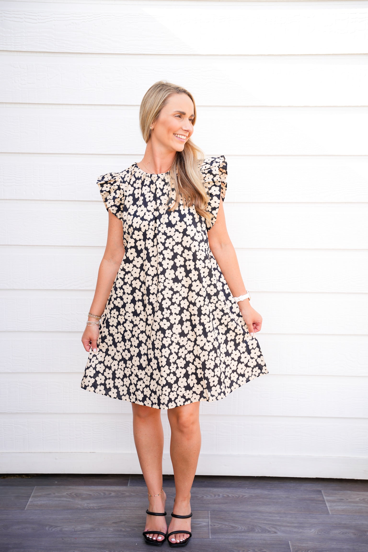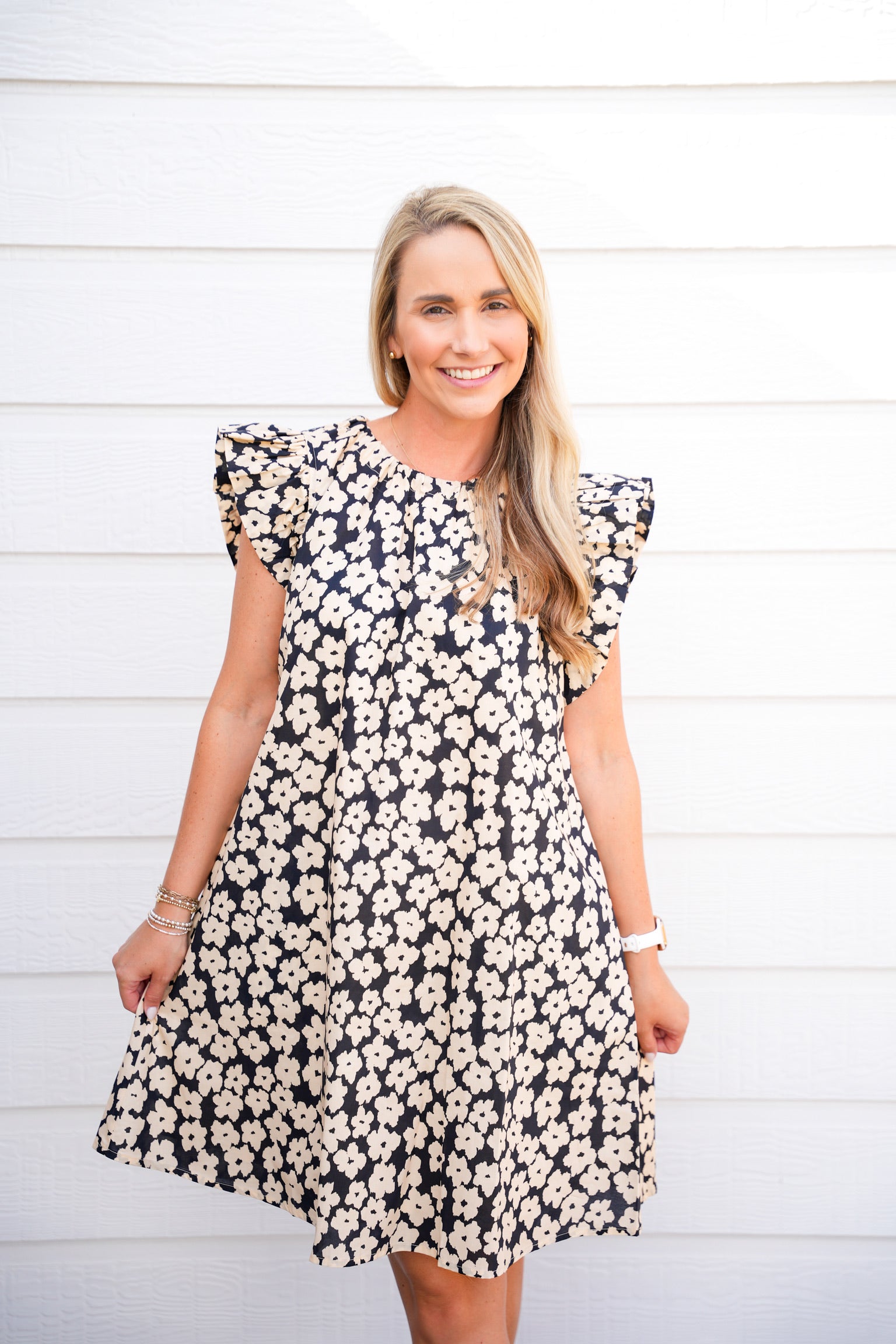 - Mini dress with flutter sleeves and gathered neckline