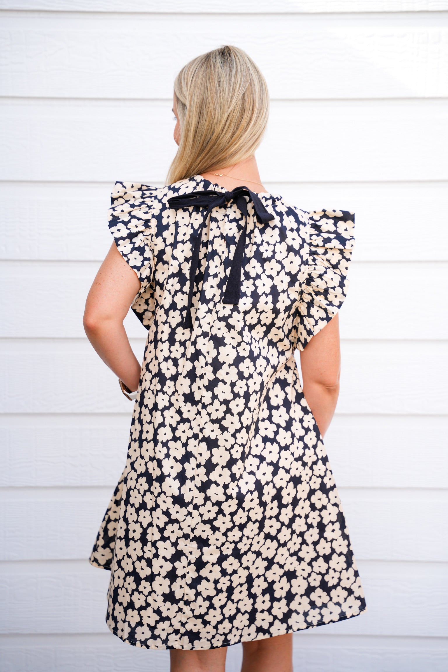 FLORAL COTTON POPLIN FLUTER SLEEVE TIE BACK NECK MINI DRESS W/ SIDE POCKET