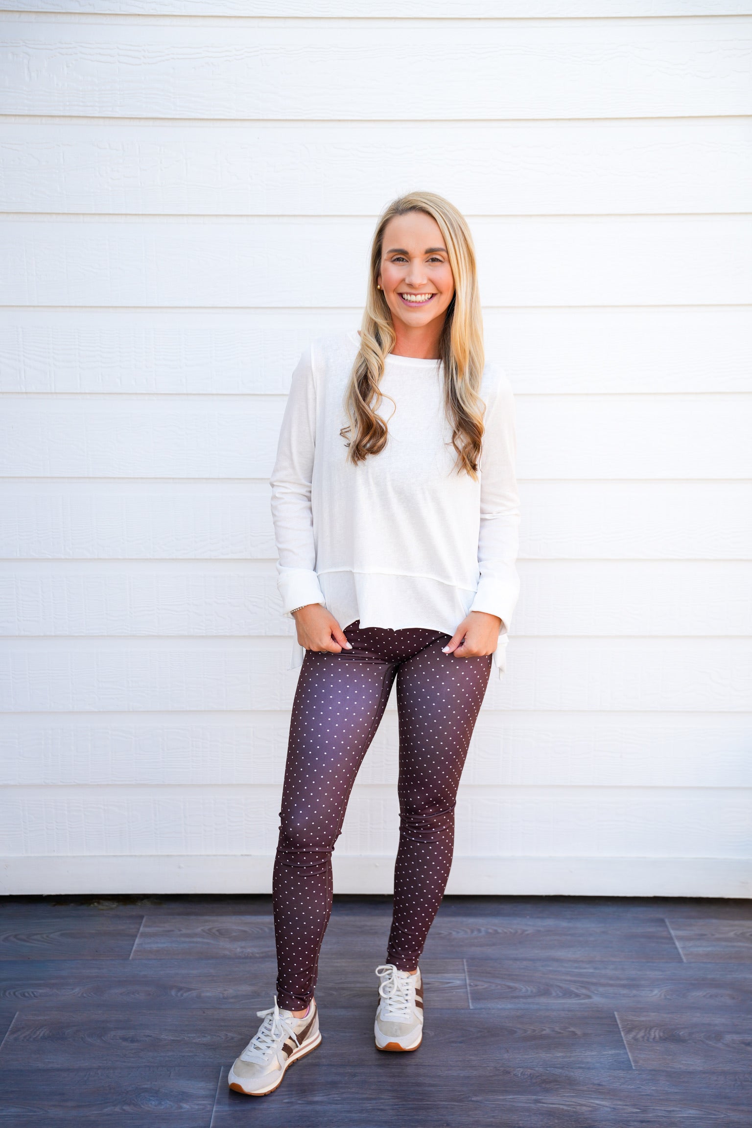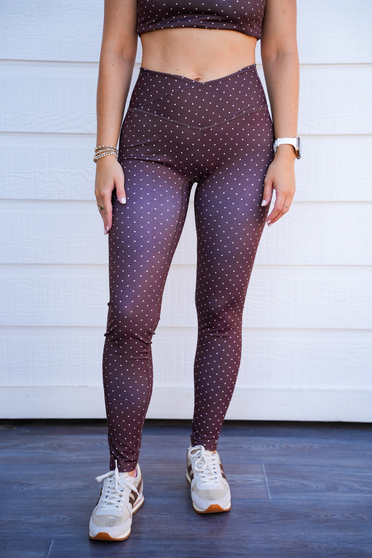 Polka dot print high waist crossover leggings with a flattering, seamless look. Butter-soft, second-skin leggings. 82% POLYESTER 18% SPANDEX