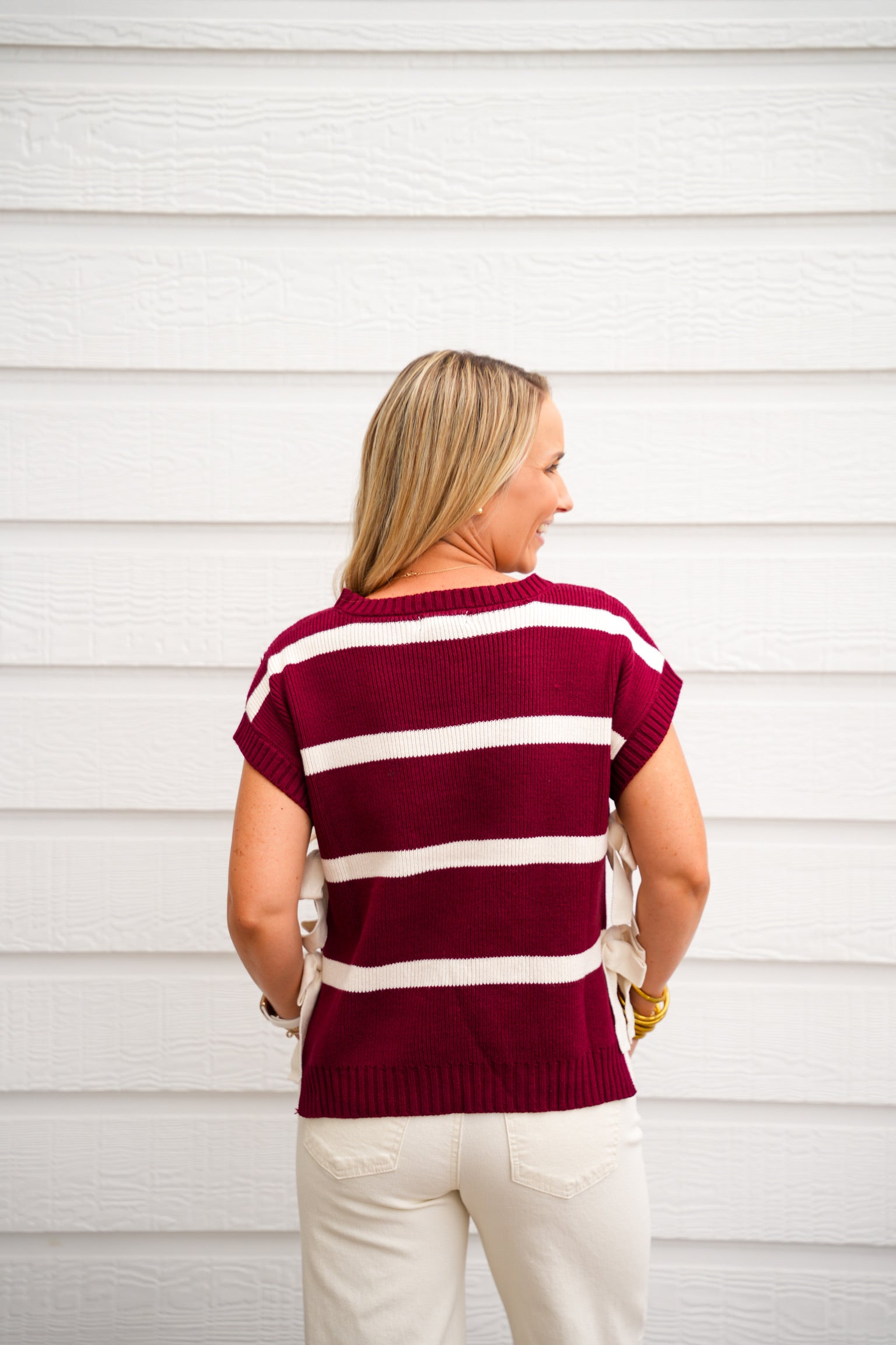 Burgundy Striped Sleeveless Sweater with Ivory Bows on sided