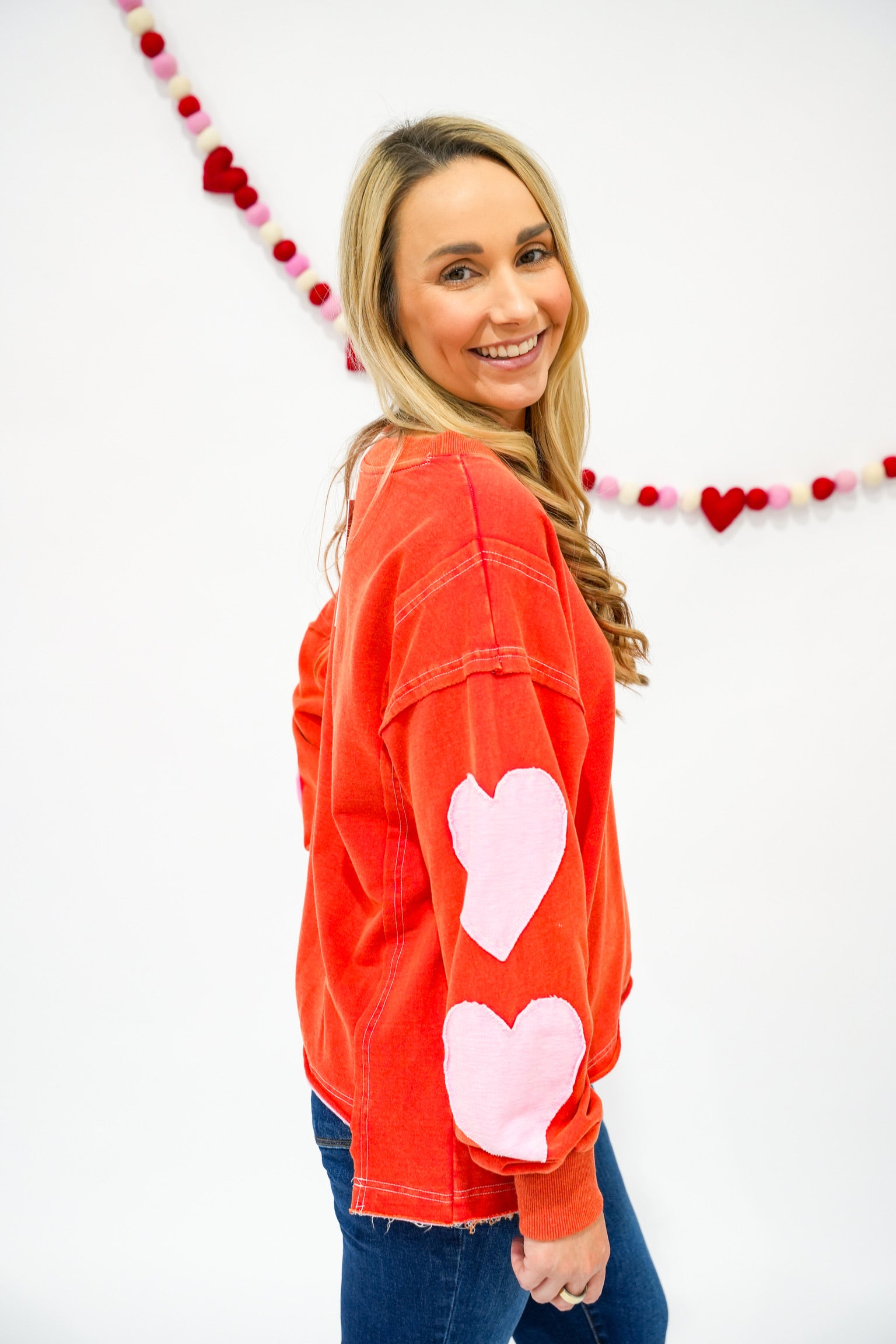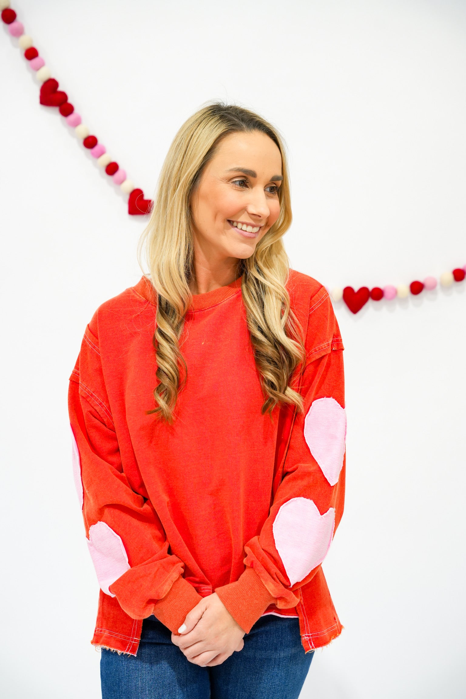 Cozy red sweatshirt featuring adorable candy heart cutouts in pink along the sleeves. Perfect for adding a sweet, whimsical touch to your everyday wardrobe. Long sleeves keep you warm while the fun design brings instant charm and personality to any outfit.