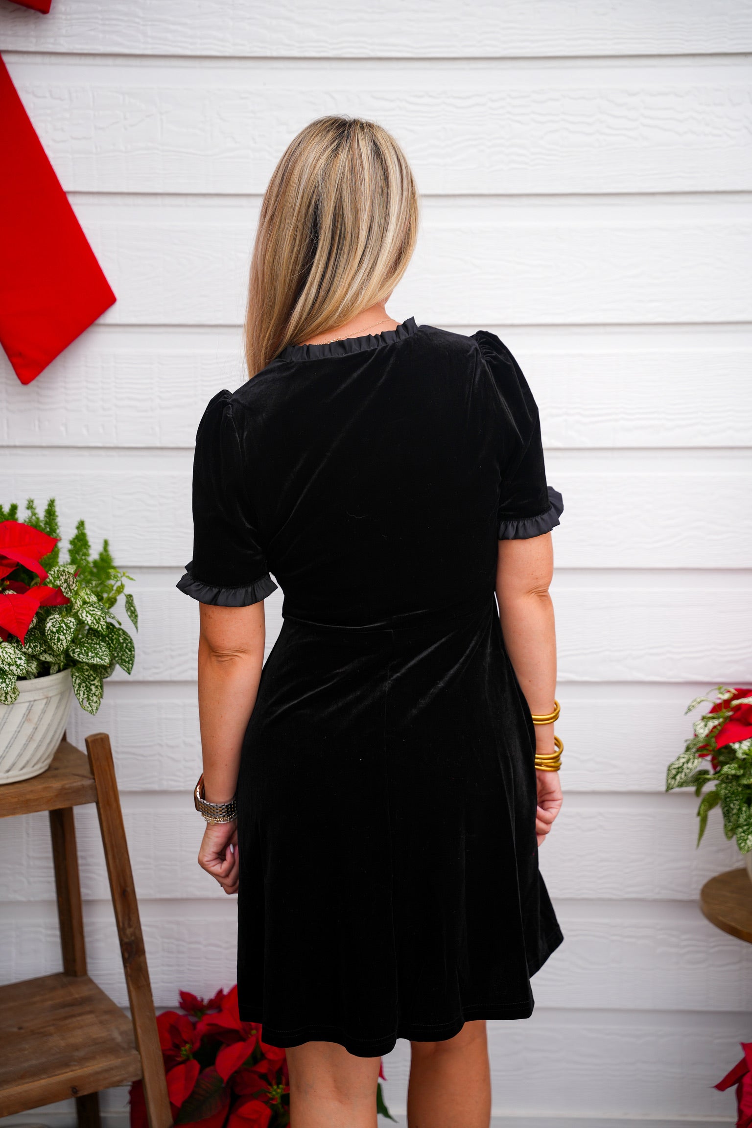 Slip into holiday magic with this stunning black velvet mini dress, complete with charming ruffled details that steal the show. Whether you're dancing at festive celebrations, capturing precious family moments, or dressing up for special occasions, this versatile stunner keeps you looking fabulous all season long. It's the one dress that does it all—from parties to photos to everything in between!