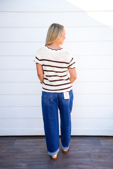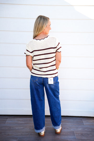 SHORT SLEEVE EDGE DETAIL STRIPED SWEATER