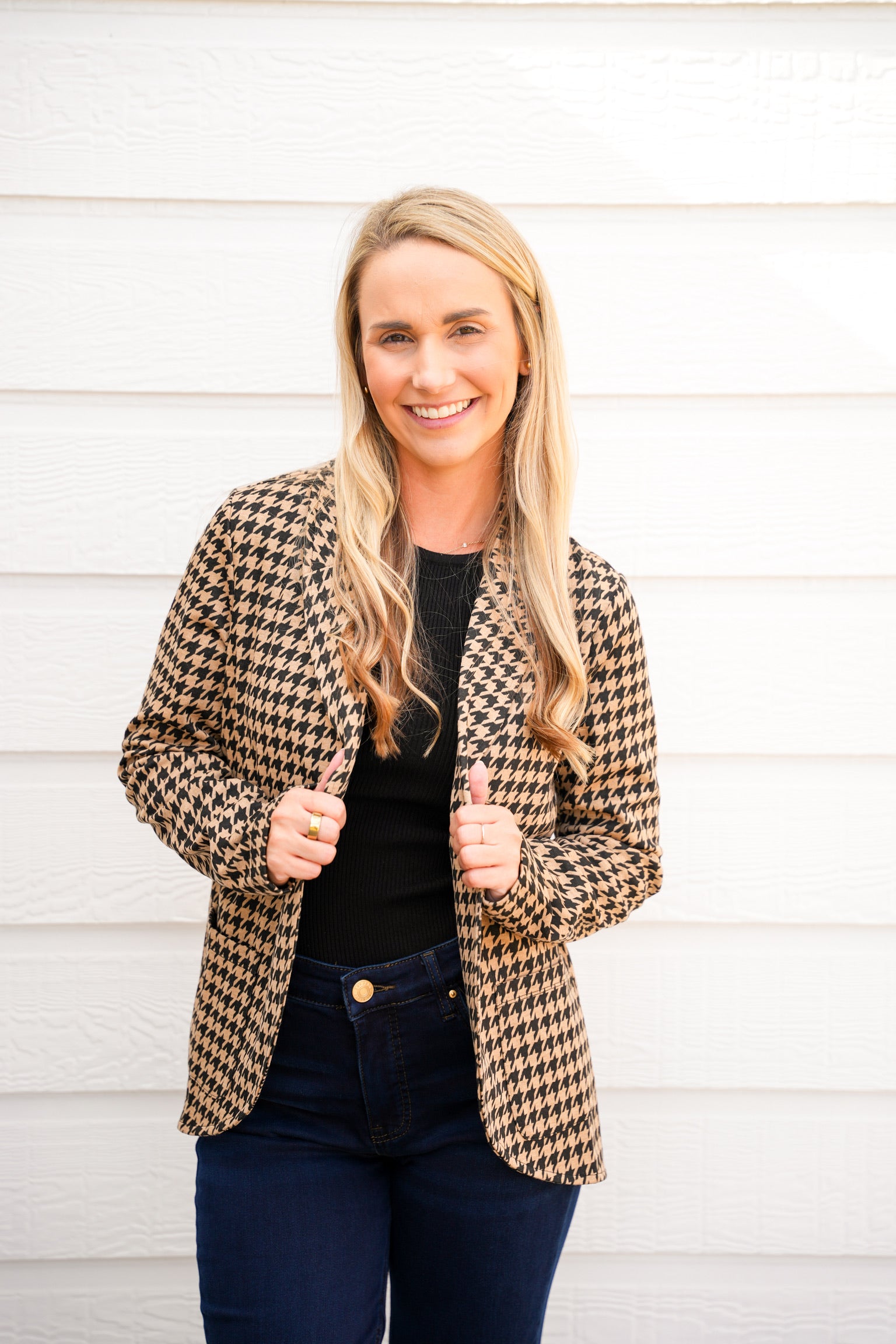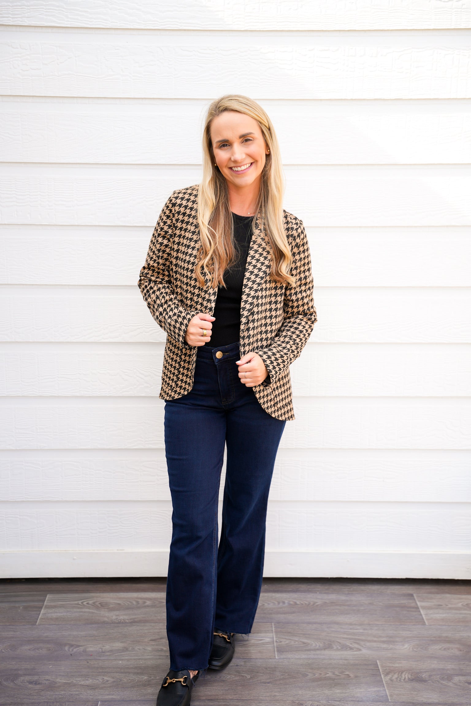 - - Features a classic houndstooth jacquard pattern for a timeless, sophisticated look