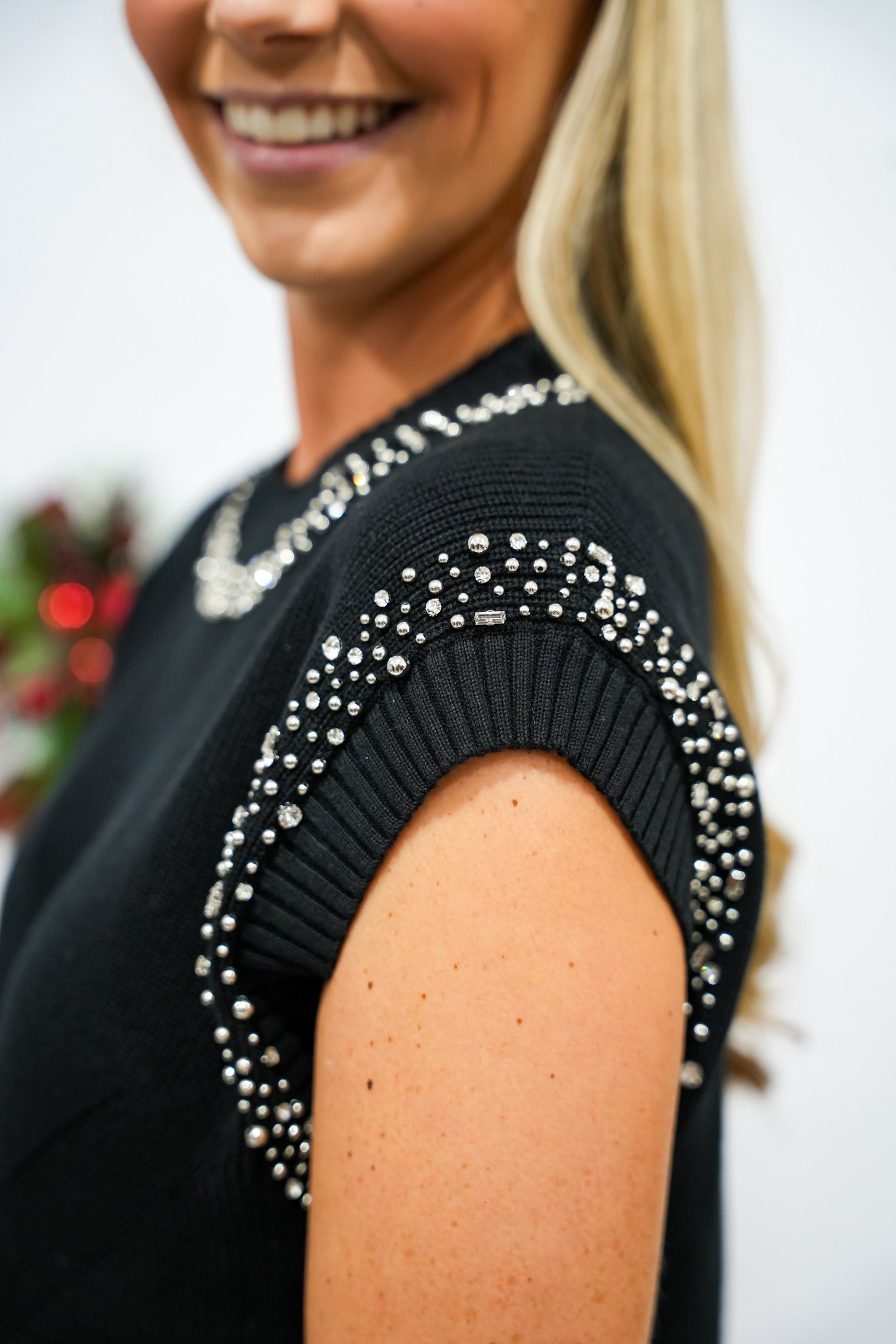 Yaritza crew neck sleeveless sweater top featuring embellished detail for a touch of elegance. Crafted from a soft blend of acrylic and cotton, pairs with favorite skirts or pants for a refined look. Quality meets chic in this charming closet staple for any lifestyle.